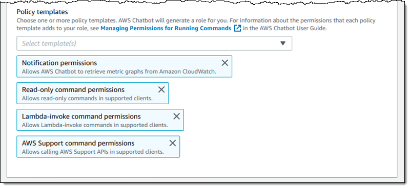 As part of the configuration process you will have the opportunity to choose an existing IAM role or to create a new one from one or more templates. The role provides AWS Chatbot with access to CloudWatch metrics, and the power to run commands, invoke Lambda functions, respond to notification actions, and generate support cases: