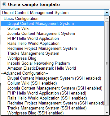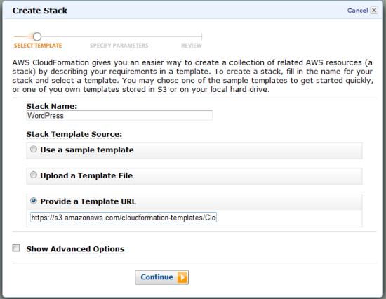 When you click that button you will be prompted for the information that AWS CloudFormation needs to create your stack. You can reference a template via a URL, upload a template from your desktop, or choose one of our sample templates. I happened to have the URL for the WordPress template handy and used that (I could have also chosen it from the list of sample templates):
