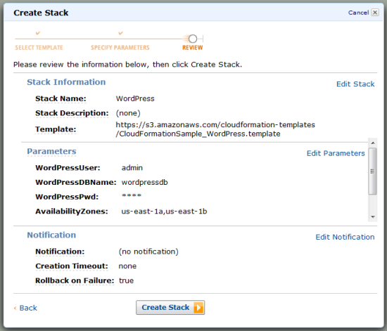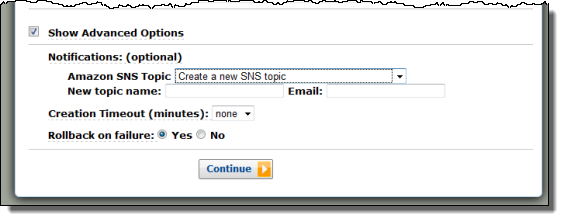 You can also choose to set some advanced options, including notification via Amazon SNS, a creation timeout, and rollback in case of failures: