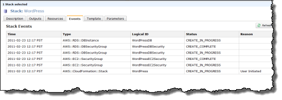 A click on the Events tab will reveal all of the actions that CloudFormation is taking to create the resources needed to realize your stack: