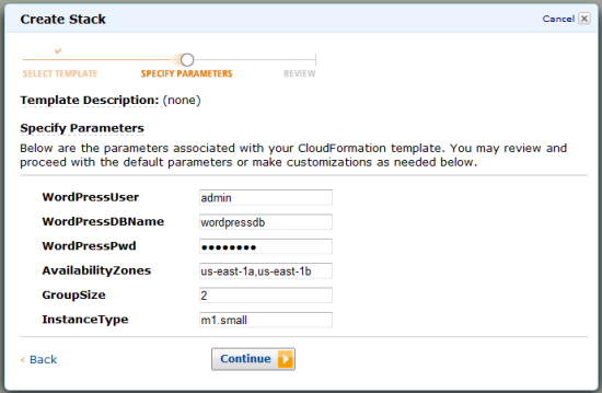 As I mentioned in my other blog post, each CloudFormation stack can include parameters. The console will prompt you for parameters based on the names and default values in your template: