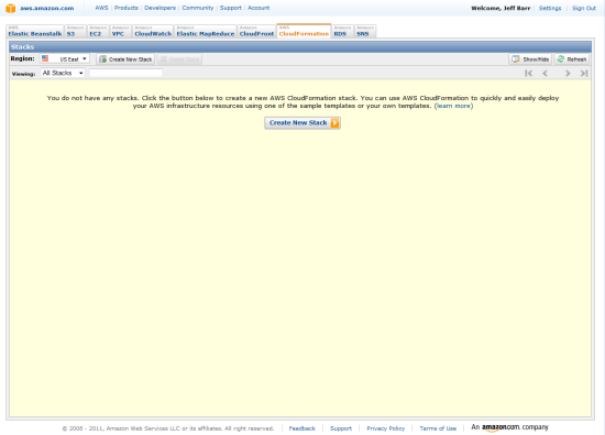 Start out on the AWS CloudFormation tab. This tab displays all of your stacks and also contains the all-important Create New Stack button: