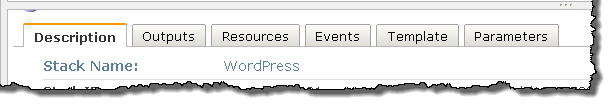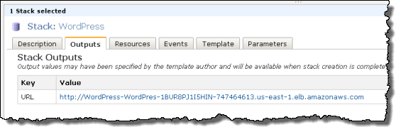 At that point, the Outputs tab will include the values specified in the template. The WordPress template that I used contains a single output, the URL of the running copy of WordPress: