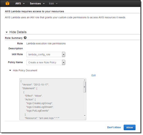 If the function needs to access other AWS resources or APIs, I would amend the policy document accordingly. I select the role, confirm that I want to create the function, and I am already halfway there: