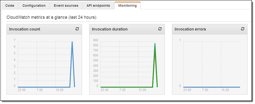 The rule will be evaluated within a few minutes; I can verify that my function has been invoked by taking a peek at the function’s Monitoring tab in the Lambda console: