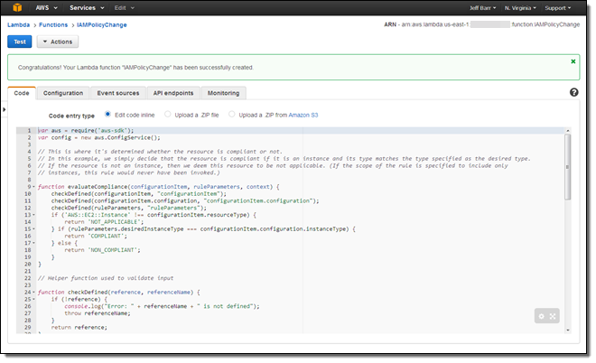 You can now use CloudFormation templates to create your Config Rules and your Lambda functions. Here’s how you would create a rule that references a function called VolumeAutoEnableIOComplianceCheck: