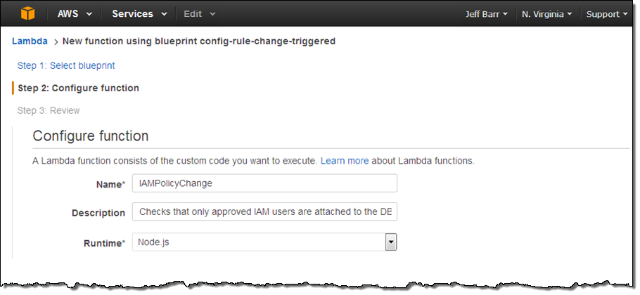 I want my rule to run every time the IAM Policy is changed, so I select the first blueprint, config-rule-change-triggered. Then I enter a name and description for the function: