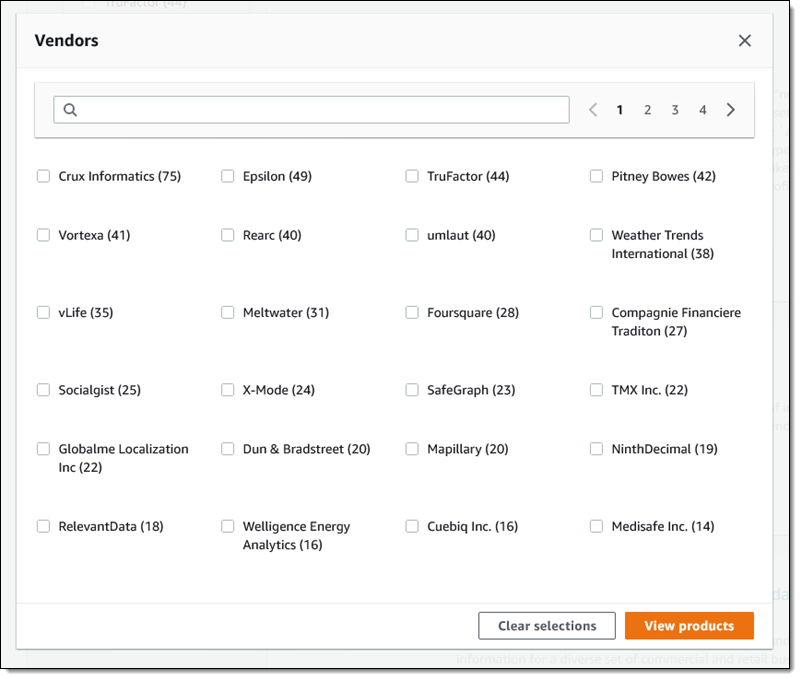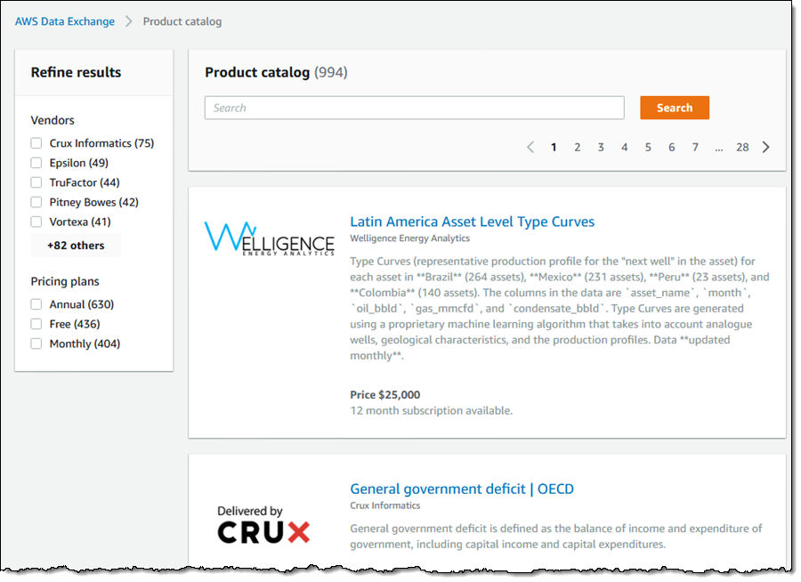 Today, we are taking the next step forward, and are launching AWS Data Exchange. This addition to AWS Marketplace contains over one thousand licensable data products from over 80 data providers. There’s a diverse catalog of free and paid offerings, in categories such as financial services, health care / life sciences, geospatial, weather, and mapping.
