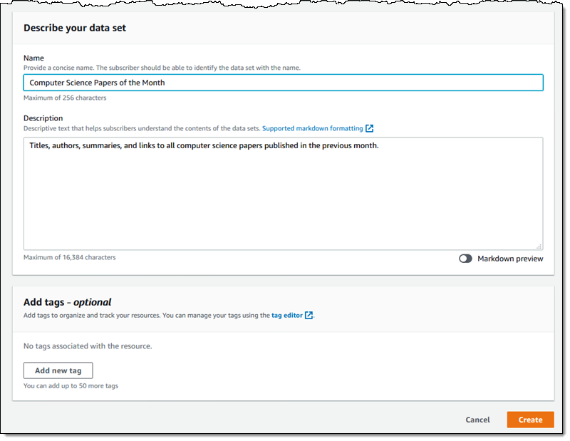 Now I am going to put my “data provider” hat and show you the basics of the publication process (the User Guide contains a more detailed walk-through). In order to be able to license data, I must agree to the terms and conditions, and my application must be approved by AWS.