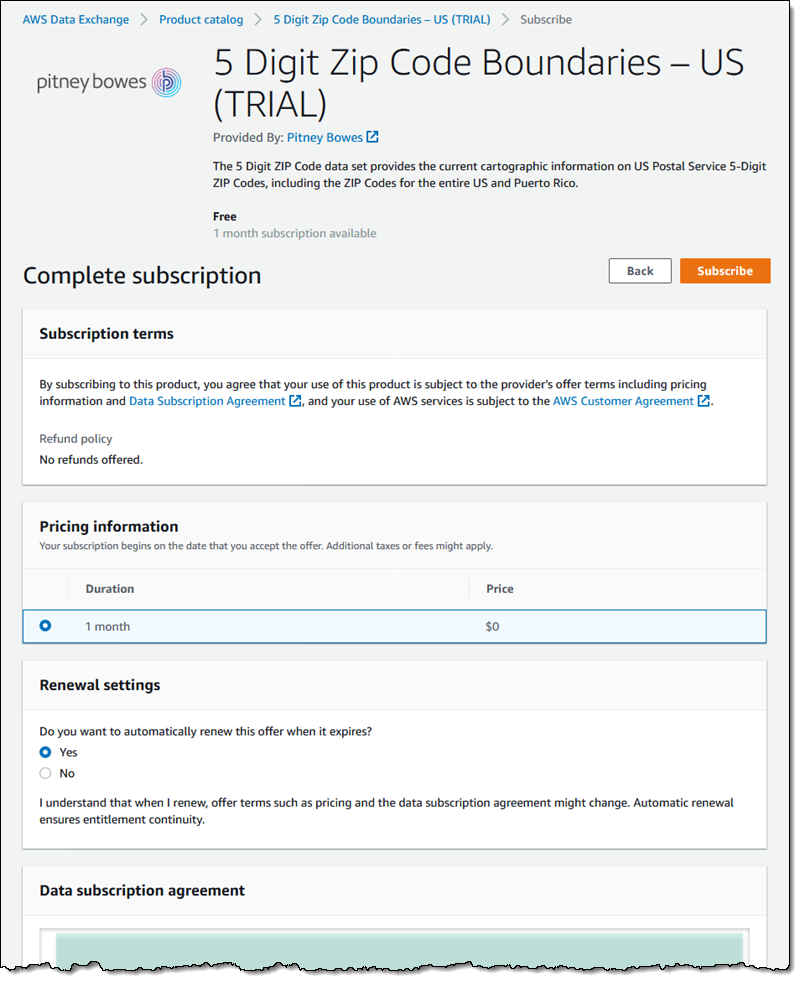 I think I can use this in my app, and want to give it a try, so I click Continue to subscribe. I review the details, read the Data Subscription Agreement, and click Subscribe: