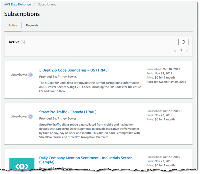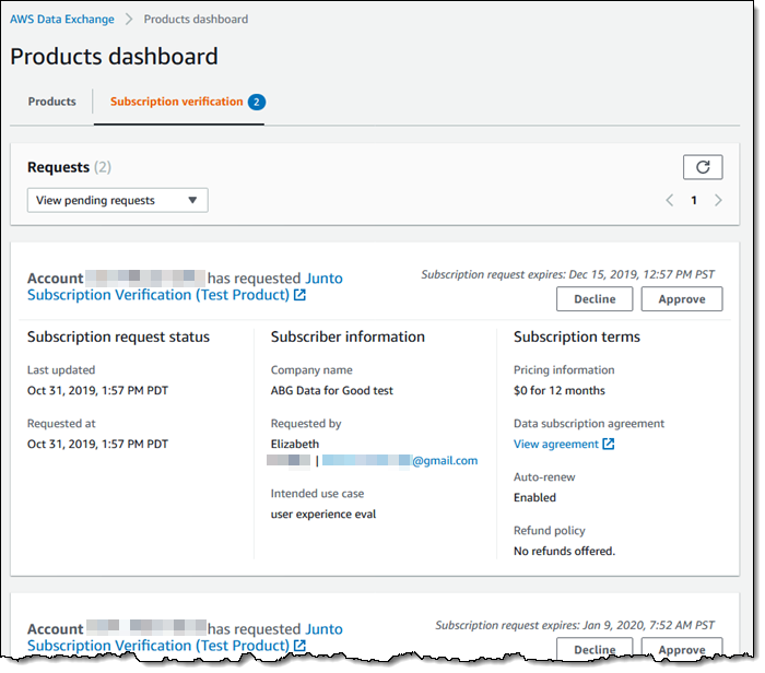 Subscription Verification – The data provider can also require additional information in order to verify my subscription. If that is the case, the console will ask me to supply the info, and the provider will review and approve or decline within 45 days: