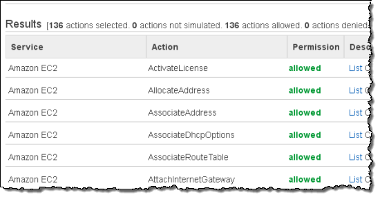 The policy will be evaluated when you push the Run Simulation button and the simulator will display the results. It looks like I don’t have access to the EC2 APIs (this is because IAM users have no permissions unless they are explicitly granted):