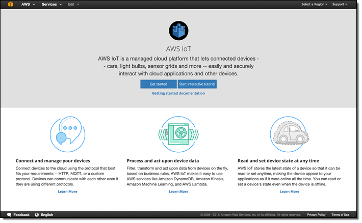The AWS IoT Console will help you get started. With a few clicks you can create your first thing, and then download the SDK, security credentials, and sample code you will need to connect a device to AWS IoT.