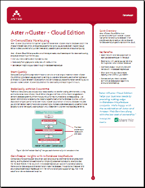 Aster Data Systems just released the Aster nCluster Cloud Edition. This release brings the Aster nCluster analytic database to the EC2 cloud, greatly simplifying the process of creating a data warehouse or BI (business intelligence) project and reducing time to market. The product includes a unique in-database MapReduce processing framework; data analysis and transformation is supported inside of the database itself. There’s more info in the data sheet.