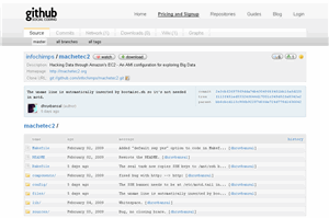 A note on the InfoChimps blog, and a hallway conversation/reminder with my colleague Deepak Singh, led me to machetEC2. Described as an “AMI configuration for exploring Big Data,” machetEC2 is an EC2 AMI pre-configured with a very long list of data processing, analysis, and visualization applications atop a solid base of Python, Ruby, and Erlang tools and libraries.