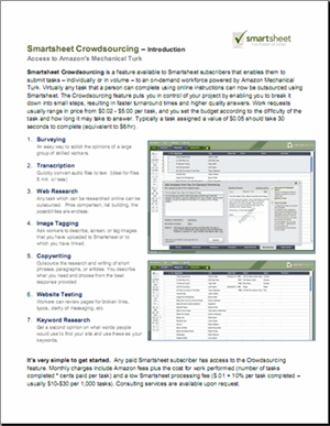 In addition to assigning tasks to partners and to co-workers, you can now assign them to qualified Mechanical Turk workers on an individual or volume basis. You can now create and successfully complete projects using a workforce of over 200,000 people from over 100 countries! The new brochure suggests that this can be used for surveying, transcription, web research, image tagging, copywriting, website testing, and keyword research. The crew at SmartSheet have called this new model smartsourcing, which sounds good to me.