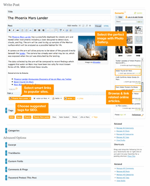 The original release of the Zemanta provided a helping hand (almost a research assistant) for bloggers, suggesting relevant links and content in real-time as the post is written. This functionality has been enhanced to allow it to recommend additional types of content, including audio, video, and maps. Zemanta takes care to recommend content that has a Creative Commons license or that has been approved for reuse by the original content provider.