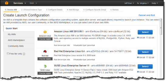 The launch configuration specifies the Amazon Machine Image (AMI), EC2 instance type, EBS storage, security group, and other details needed to launch new instances as part of the scale-up process. The console leads you through the necessary steps, beginning with the selection of the desired AMI: