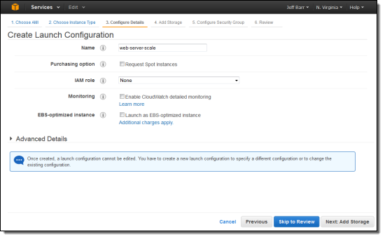 Then you provide a name for your launch configuration, along with an IAM role, enable CloudWatch detailed monitoring, and request EBS-optimized instances. You can even choose a purchasing option (On- Demand or Spot).