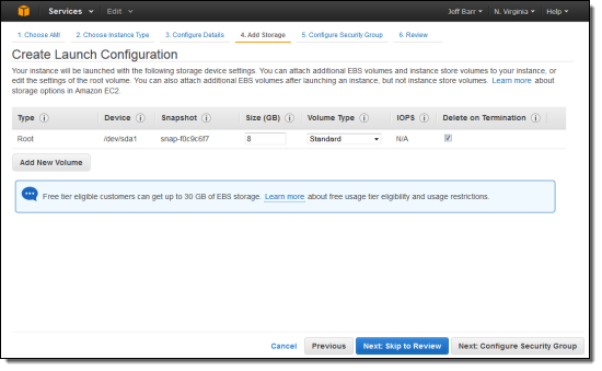 You can also request the creation of new EBS disk storage volumes as part of the launch. These volumes can be deleted on termination, or they can be left around. The first option is perfect if you use the EBS volumes for temporary storage; the second would be appropriate if you generate log files on the instance and need to move them to long-term storage after the instance has been terminated.