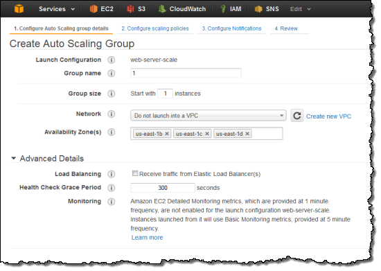 The console will lead you through the steps needed to create your Auto Scaling group. You can set the initial size (number of EC2 instances) of the group, along with the desired minimum and maximum size. You can also choose to launch the instances into a particular Virtual Private Cloud (VPC), and you can select the desired Availability Zones.