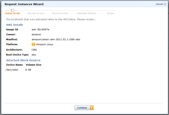 If you create AMIs and share them with others, this is an easy way to pass references around so that they can be launched with ease. When the link is activated the console will start as follows (prompting for email address and password if necessary):