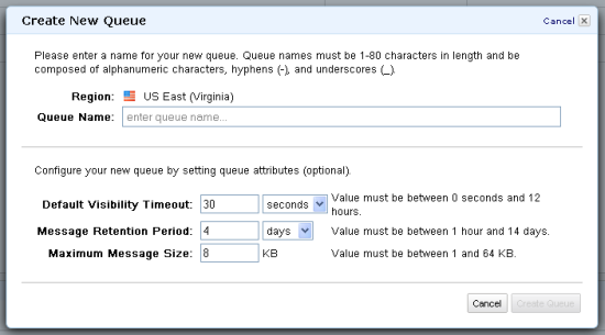 You can create a new queue by filling in a form. You have control over the visibility timeout, message retention period, and the maximum message size: