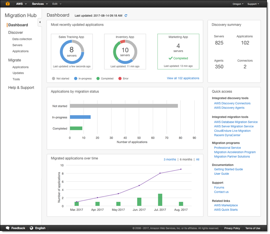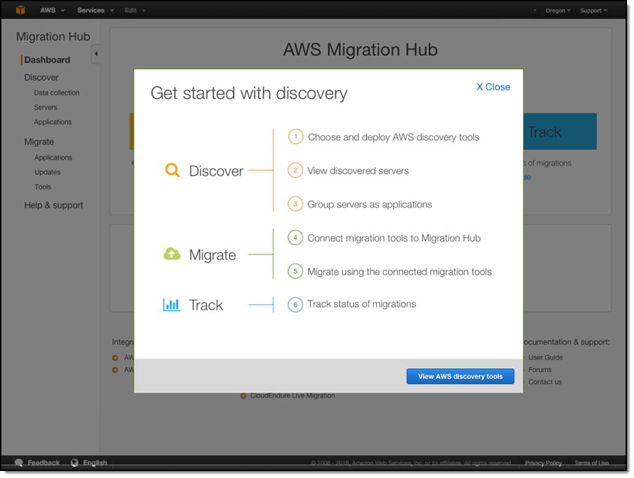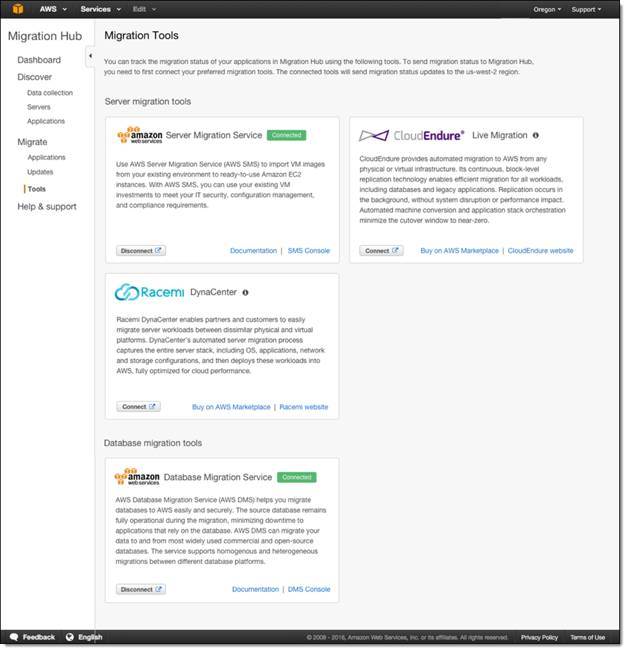 Today we are bringing this collection of AWS and partner migration tools together in the AWS Migration Hub. The hub provides access to the tools that I mentioned above, guides you through the migration process, and tracks the status of each migration, all in accord with the methodology and tenets described in our Migration Acceleration Program (MAP).