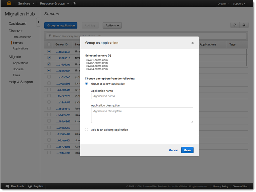 The Servers list is populated using data from an AWS migration service (Server Migration Service or Database Migration Service), partner tools, or using data collected by the AWS Application Discovery Service: