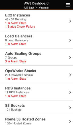 The AWS Console mobile app supports Amazon EC2, Elastic Load Balancing, Amazon S3, Amazon Relational Database Service, Route 53 Hosted Zones, Auto Scaling, AWS OpsWorks, CloudWatch, and the Service Health Dashboard. You can use the app to monitor the status and health of your AWS resources on your iOS or Android device: