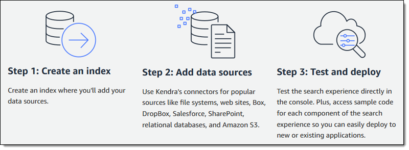 Amazon Kendra – An accurate and easy-to-use enterprise search service that is powered by machine learning. Kendra makes content from multiple, disparate sources searchable with powerful natural language queries: