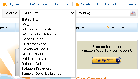 The portal’s brand-new search function is contextual and faceted. You can choose to search the entire AWS site or you can limit your search to just one area using the Search menu: