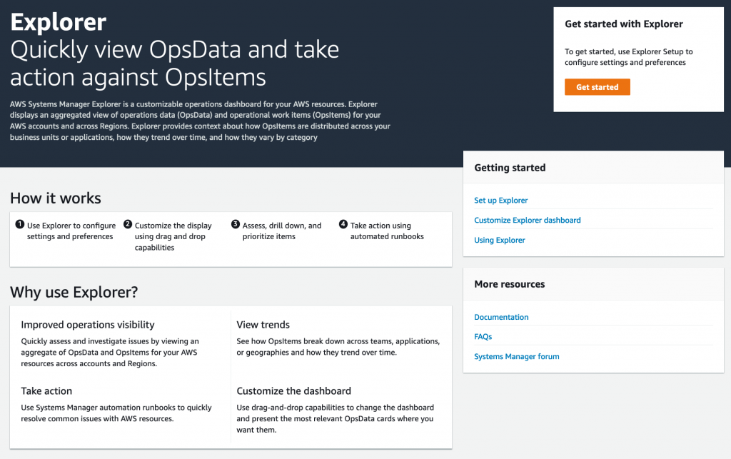 Before using Explorer, we recommend that you first set up Config and Systems Manager. This will help populate your Explorer dashboard immediately. No setup is required for CloudWatch events.