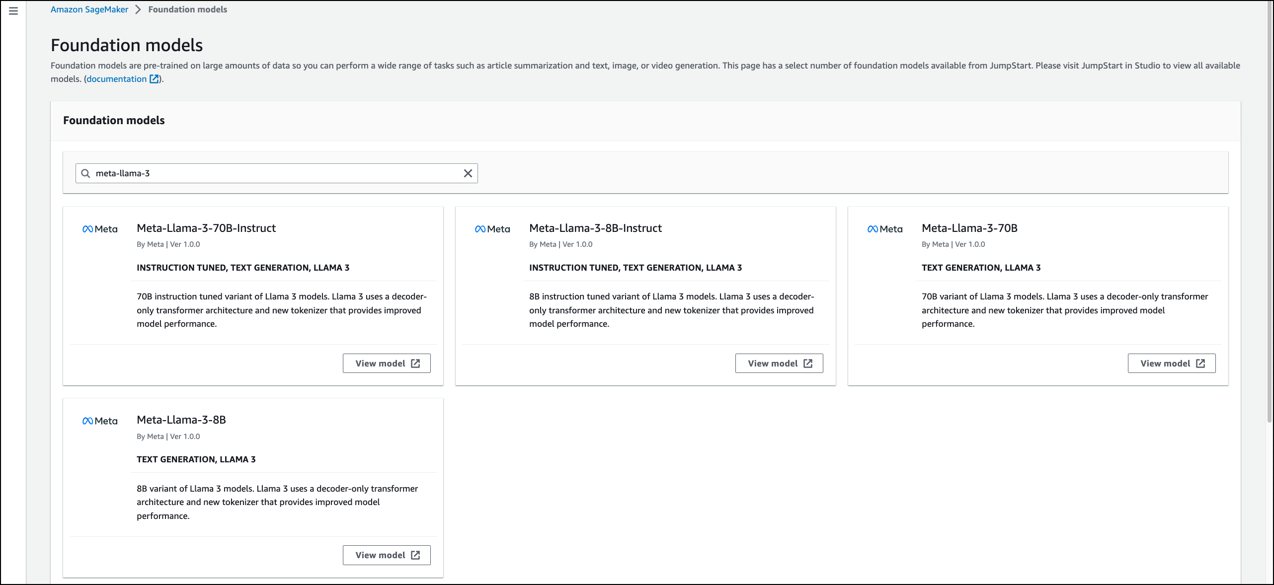 Meta Llama 3 now available in Amazon SageMaker JumpStart – Meta Llama 3 is now available in Amazon SageMaker JumpStart, a machine learning (ML) hub that can help you accelerate your ML journey. You can deploy and use Llama 3 foundation models (FMs) with a few steps in Amazon SageMaker Studio or programmatically through the Amazon SageMaker Python SDK. Llama is available in two parameter sizes, 8B and 70B, and can be used to support a broad range of use cases, with improvements in reasoning, code generation, and instruction following. The model will be deployed in an AWS secure environment under your VPC controls, helping ensure data security.