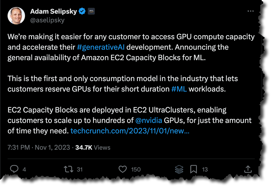 AWS Weekly Roundup—Reserve GPU capacity for short ML workloads, Finch is GA, and more—November 6, 2023