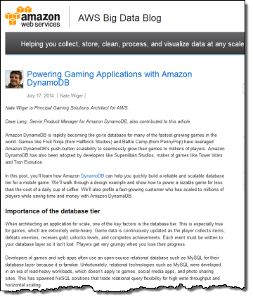 The first two posts on the blog show you how to Build a Recommender with Apache Mahout on Amazon Elastic MapReduce and how to Power Gaming Applications with Amazon DynamoDB.