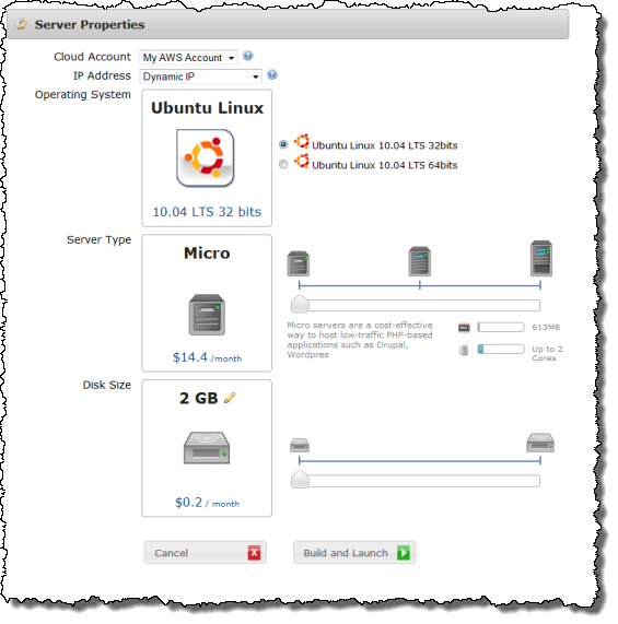 You can choose between 32 and 64 bit versions of Ubuntu Linux, choose an EC2 instance type, and configure the desired amount of disk space (this step is optional and defaults are supplied). Monthly costs are displayed for each option: