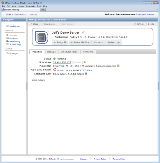 Erica and Daniel told me that they are working hard to add additional features to BitNami Cloud Hosting, including scheduled server resizing, support for regions other than US-East, additional Linux distributions, Microsoft Windows, and notifications.