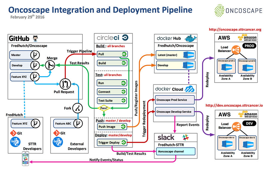 The diagram below depicts the full Oncoscape integration and deployment pipeline, including the merger points between GitHub, Circleci, DockerHub, Slack, and AWS.