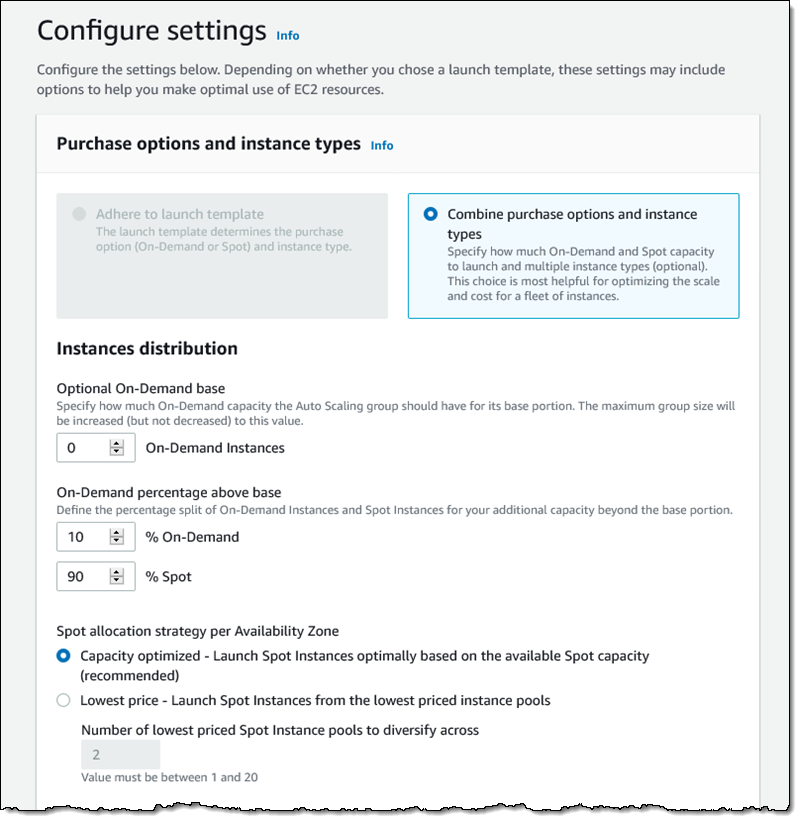 Because my launch template does not specify an instance type, Combine purchase options and instance types is pre-selected and cannot be changed. I ensure that the Capacity-optimized allocation strategy is also selected, and set the desired balance of On-Demand and Spot Instances: