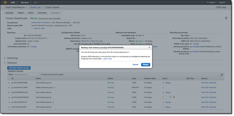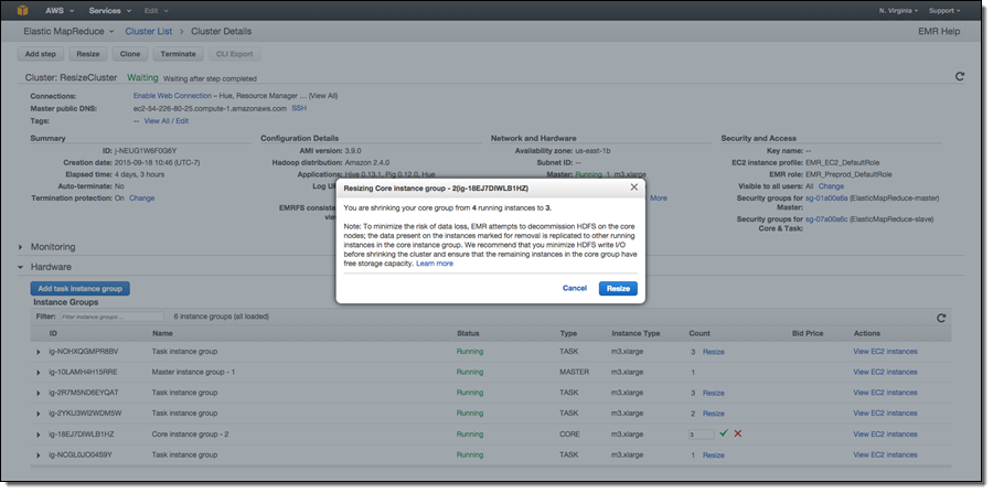 In release 4.1.0, we have added an Intelligent Resize feature set so you can now shrink your EMR cluster with minimal impact to running jobs. Additionally, when adding instances to your cluster, EMR can now start utilizing provisioned capacity as soon it becomes available. Previously, EMR would need the entire requested capacity to become available before allowing YARN to send tasks to those nodes. Also, you can now issue a resize request to EMR while a current resize request is being executed (to change the target size of your cluster), or stop a resize operation.