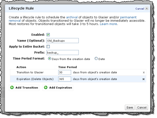 How would you like to have the best of both worlds? How about rapid retrieval of fresh data stored in S3, with automatic, policy-driven archiving to lower cost Glacier storage as your data ages, along with easy, API-driven or console-powered retrieval?