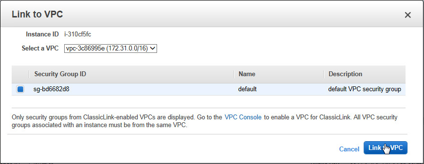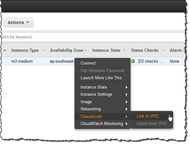 Now you can link any or all of your EC2 instances to the VPC by right-clicking and choosing Link to VPC from the ClassicLink menu: