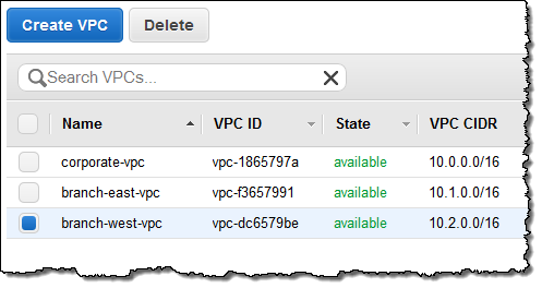 I used the AWS Management Console to set up a VPC peering connection between two of my VPCs, which were named corporate-vpc and branch-east-vpc. Here are the IDs and the CIDRs: