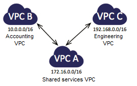 After you set up the peering connections and add entries to the routing tables (to direct packets out of one VPC and into another), the EC2 instances in the Accounting VPC can access the Shared Resources VPC, as can the instances in the Engineering VPC. However, the Accounting instances cannot access the Engineering instances, or vice versa. Peering connections are not transitive; you would need to set up a peering connection between Engineering and Accounting in order to establish connectivity. Think about extending this model with an Operations VPC that is peered with all of the other VPCs in your organization.