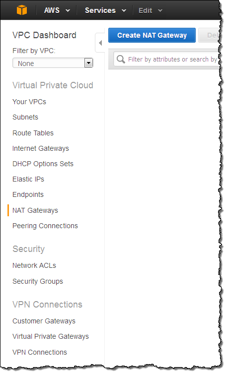 Let’s create a Managed NAT Gateway! Open up the VPC Console, and take a peek at the navigation area on the left. Locate and click on NAT Gateways: