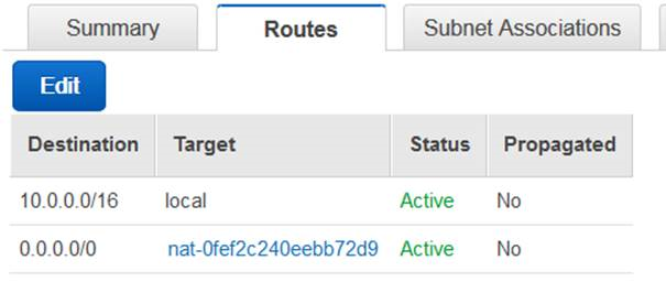 As you can see from the confirmation, you will need to edit your VPC’s route tables to send traffic destined for the Internet toward the gateway. The gateway’s internal (private) IP address will be chosen automatically, and will be on the subnet associated with the gateway. Here’s a sample route table: