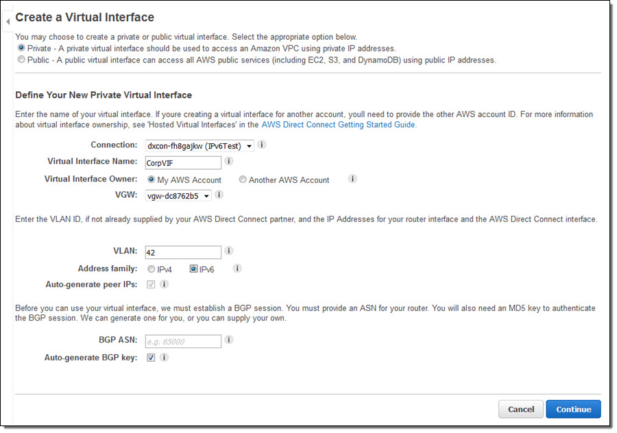 Direct Connect – Supports single and dualstack configurations on public and private VIFs (virtual interfaces).