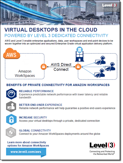 Level 3 Communications Powers Amazon WorkSpaces – Connects enterprise applications, data, user workspaces, and end-point devices to offer reliable performance and a better end-user experience:
