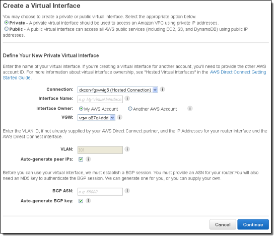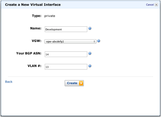 And here’s how you create a private one. Note that a private Virtual Interface always connects to a specific Virtual Private Gateway on a particular VPC: